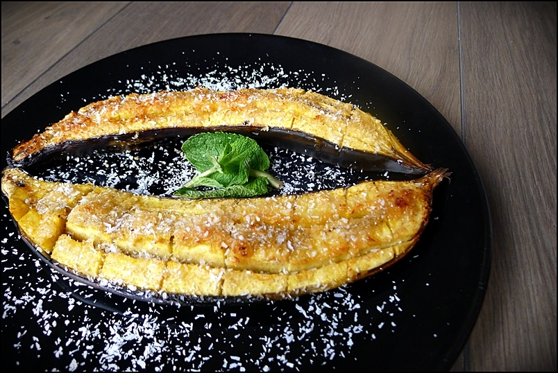 - Bake for 20 minutes, basting regularly with the banana juice flowing into the baking dish.
