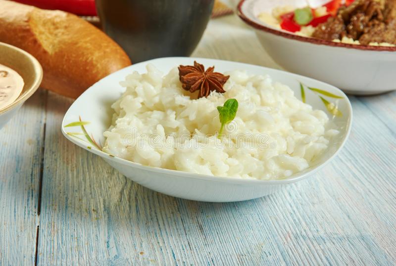 It is often served warm, although it can also be served chilled when the weather is exceptionally hot. It is recommended to garnish the rice pudding with coconut chips on top.